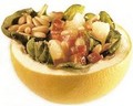 Corte todos los ingredientes en trozos, mézclelos, colóquelos en una mitad de piña y sírvala junto con el aderezo para que se lo agreguen al gusto.