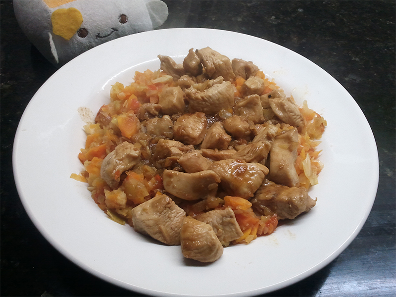 Para las verduras, simplemente picamos o cortamos las verduras que queramos agregar (en mi caso fueron: tomate, cebolla, puerro, zanahoria, morrón y ajo), y las rehogamos en wok con un poco de aceite de oliva y salsa de soja a gusto. Condimentar y servir.
