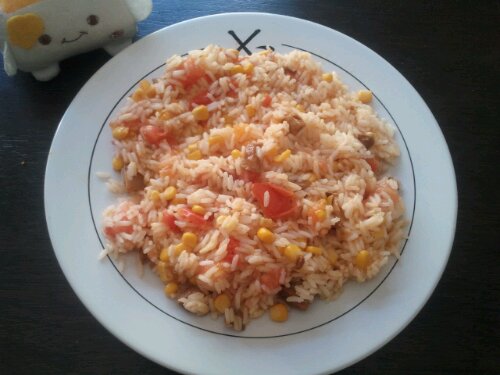 Y por otra parte en un sartén, rehogar varios dientes de ajo con 2 tomates, luego agregar choclo (u otra legumbre a elección) y calamares (de lata ya cocidos).