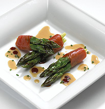 Espolvorear las lonchas de salmón con eneldo y unas gotas de limón.Envolver cada esparrago en una loncha de salmón