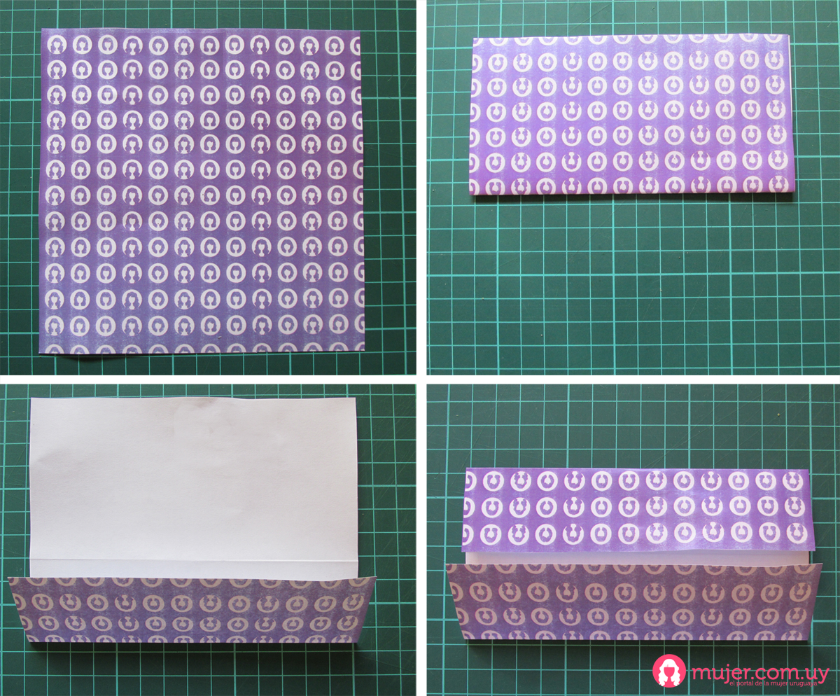Primero, doblamos la hoja a la mitad, dejando el diseño que queremos ver en la flor terminada hacia afuera, para marcar la mitad. La abrimos, y doblamos nuevamente, esta vez hacia la línea que acabamos de marcar, ambos lados.