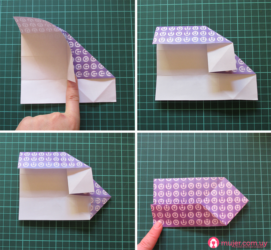 A continuación doblamos la hoja abierta hacia abajo por la diagonal marcada, y al llegar a la línea inferior, doblamos hacia el costado lo que nos sobra. Se doblará la parte de arriba de la hoja, generando un cuadradito blanco en la solapa. Luego doblamos la esquina más pequeña en diagonal hacia arriba, y hacia atrás la parte de arriba de la hoja.