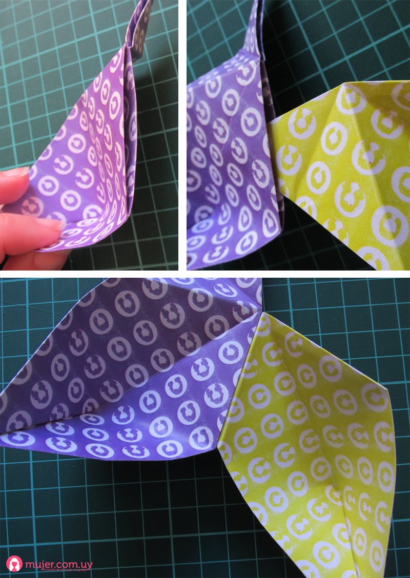 Lo único que nos falta para terminar el pétalo, es marcar los dobleces de la punta que servirá de enganche entre los pétalos. Doblamos la punta hacia arriba por la diagonal marcada por el otro lado, y nuevamente hacia el otro lado, generando pequeños triángulos. Y pronto el pétalo!