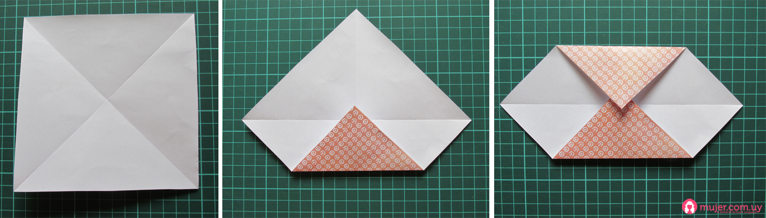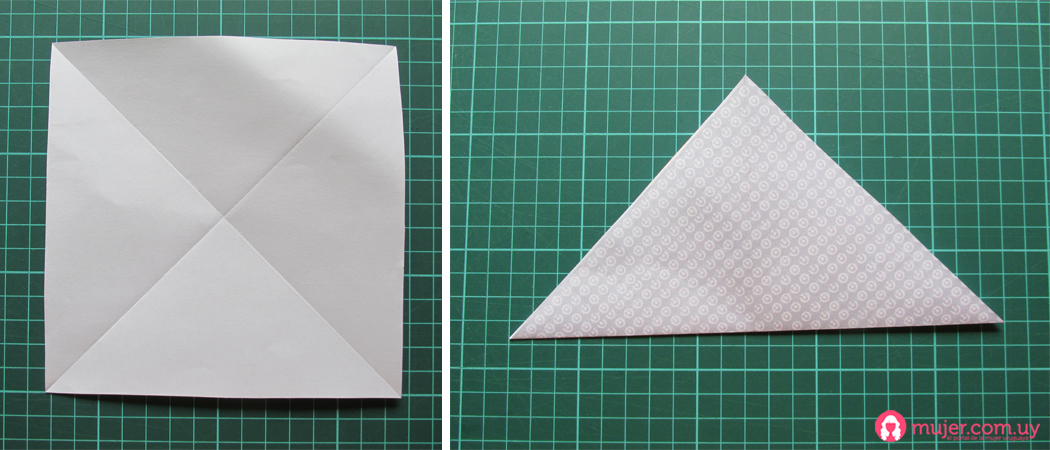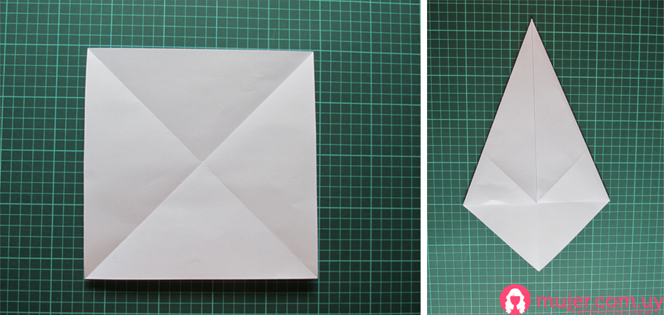 Comenzamos con una hoja de papel cuadrada, le marcamos una diagonal, y tomamos las otras puntas y las doblamos hacia el centro, pasándonos del medio.