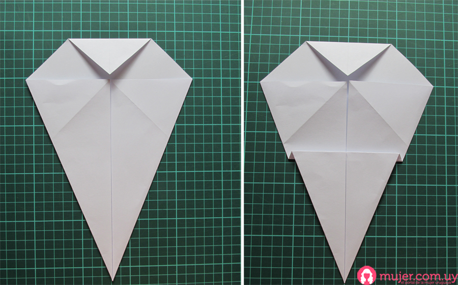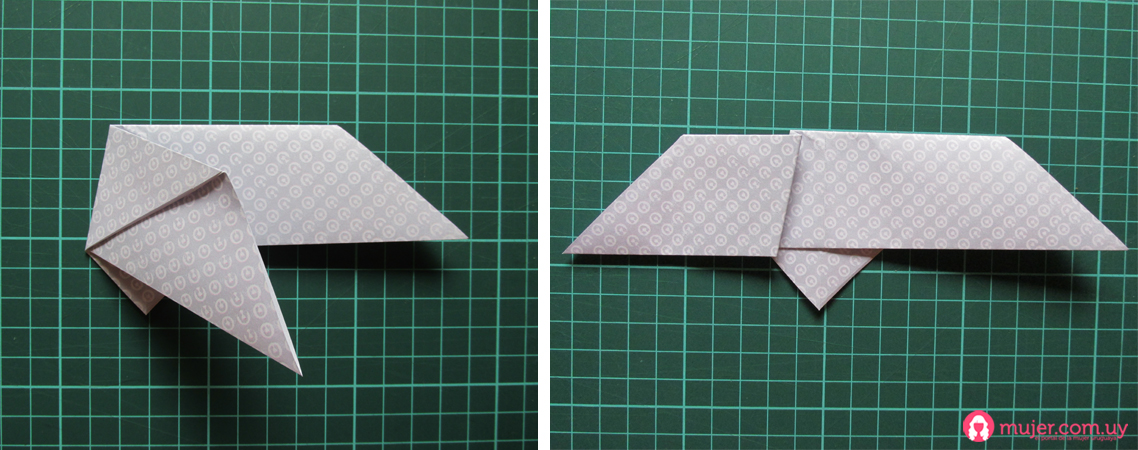 Doblamos apenitas los lados de la punta en diagonal para darle más volumen, y la parte de arriba hacia adelante para hacerle la cabeza.