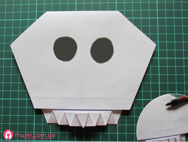 Y doblamos el lado más largo hacia adetro y hacia afuera, dejando una pequeña diferencia, que le va a dar profundidad a nuestra calavera.