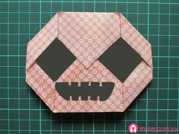Damos vuelta la calabaza, y doblamos las puntas de la diagonal hacia atrás, sin llegar al hueco de los ojos.