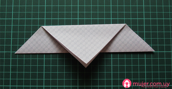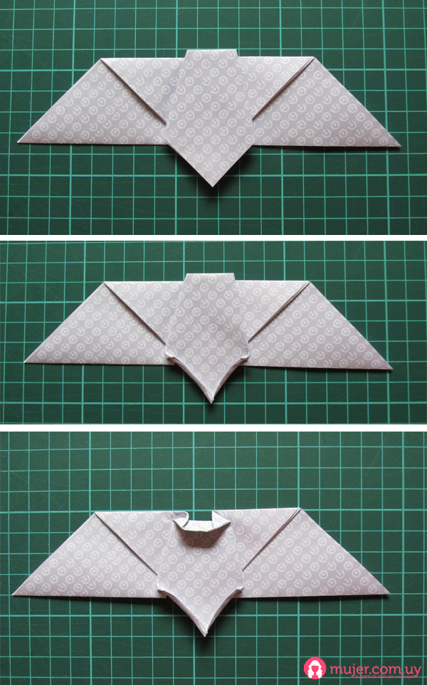 Damos vuelta del murciélago, y doblamos haciendo una diagonal desde el punto donde se cruzan los dobleces, y doblamos nuevamente en paralelo a la diagonal. Repetimos del otro lado.