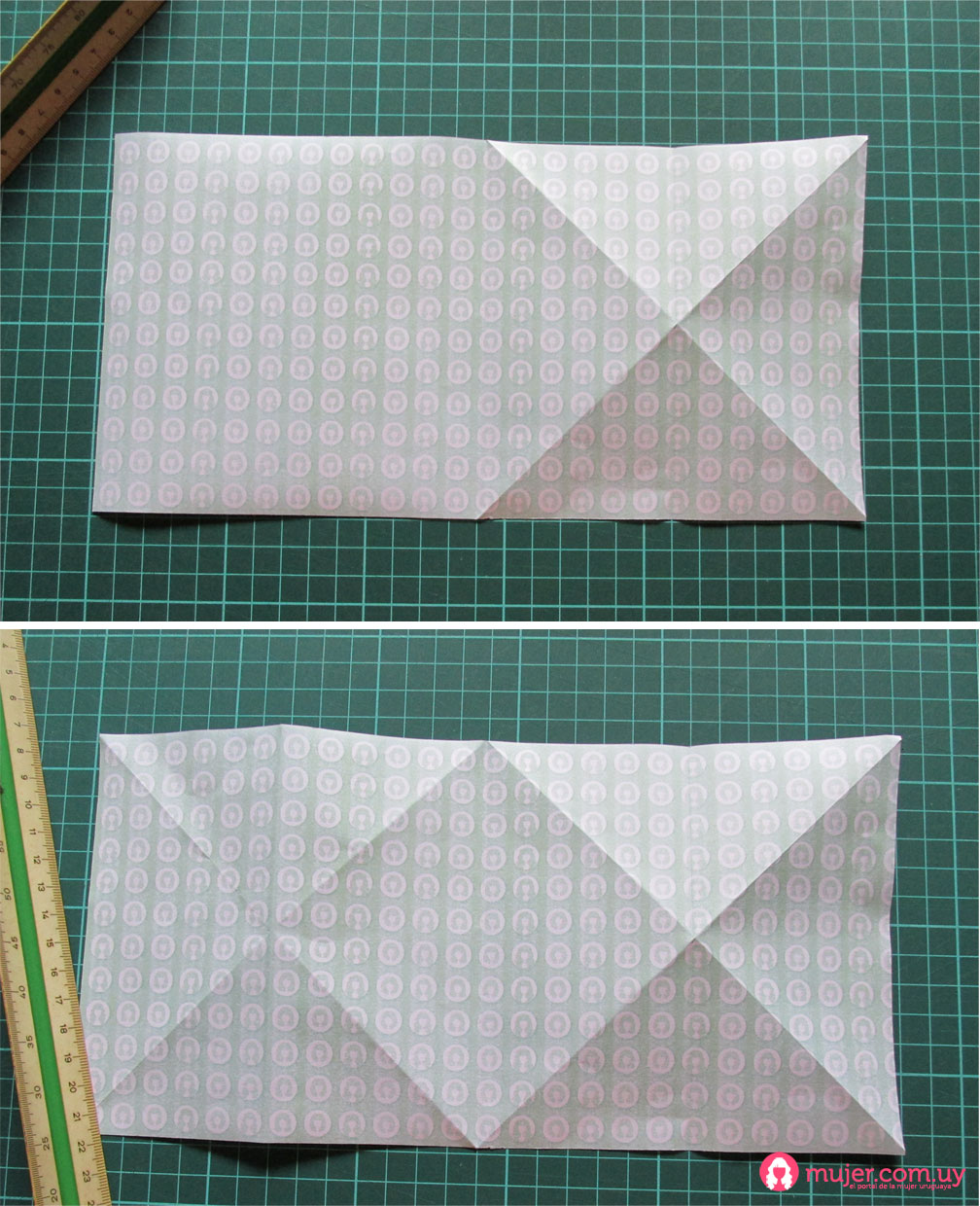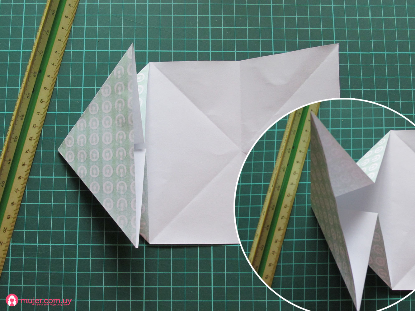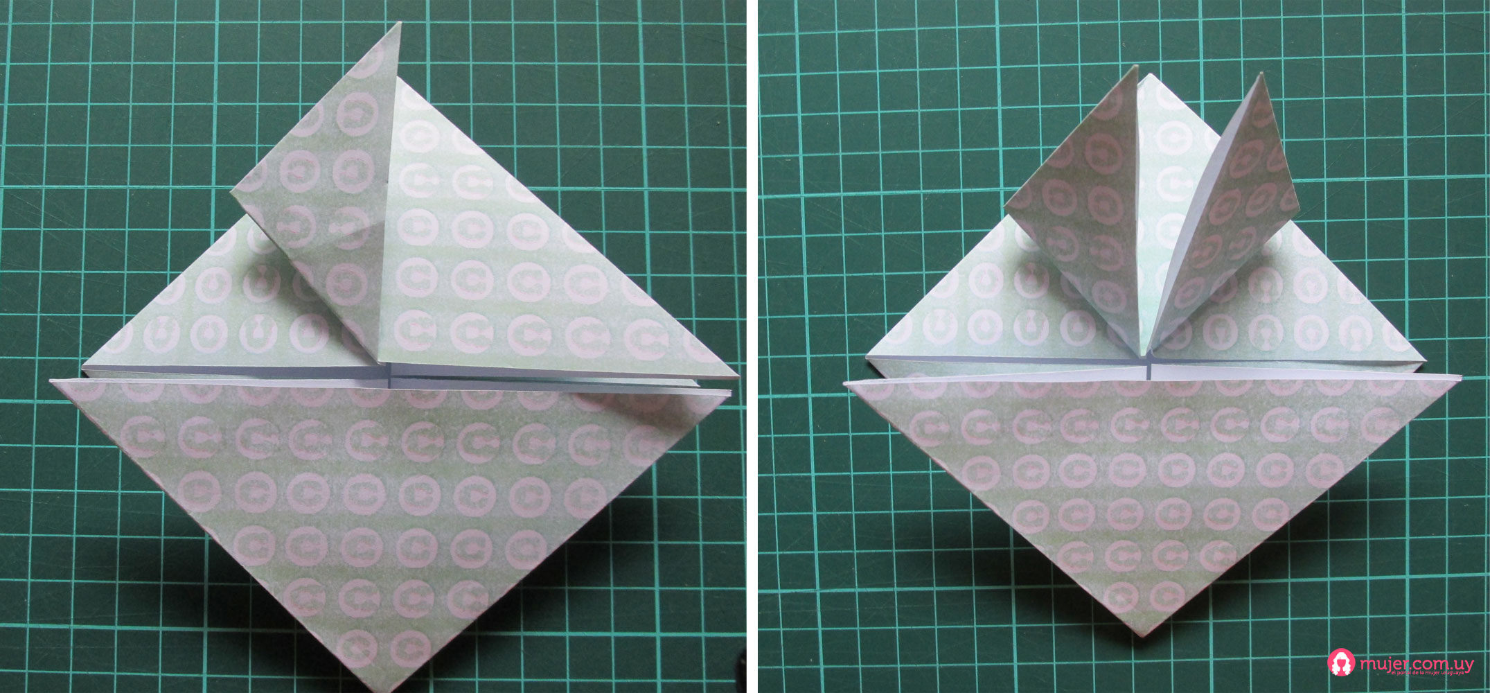 A continuación, tomamos las puntas de la parte de arriba, y las doblamos hacia el centro como se ve en la foto.
