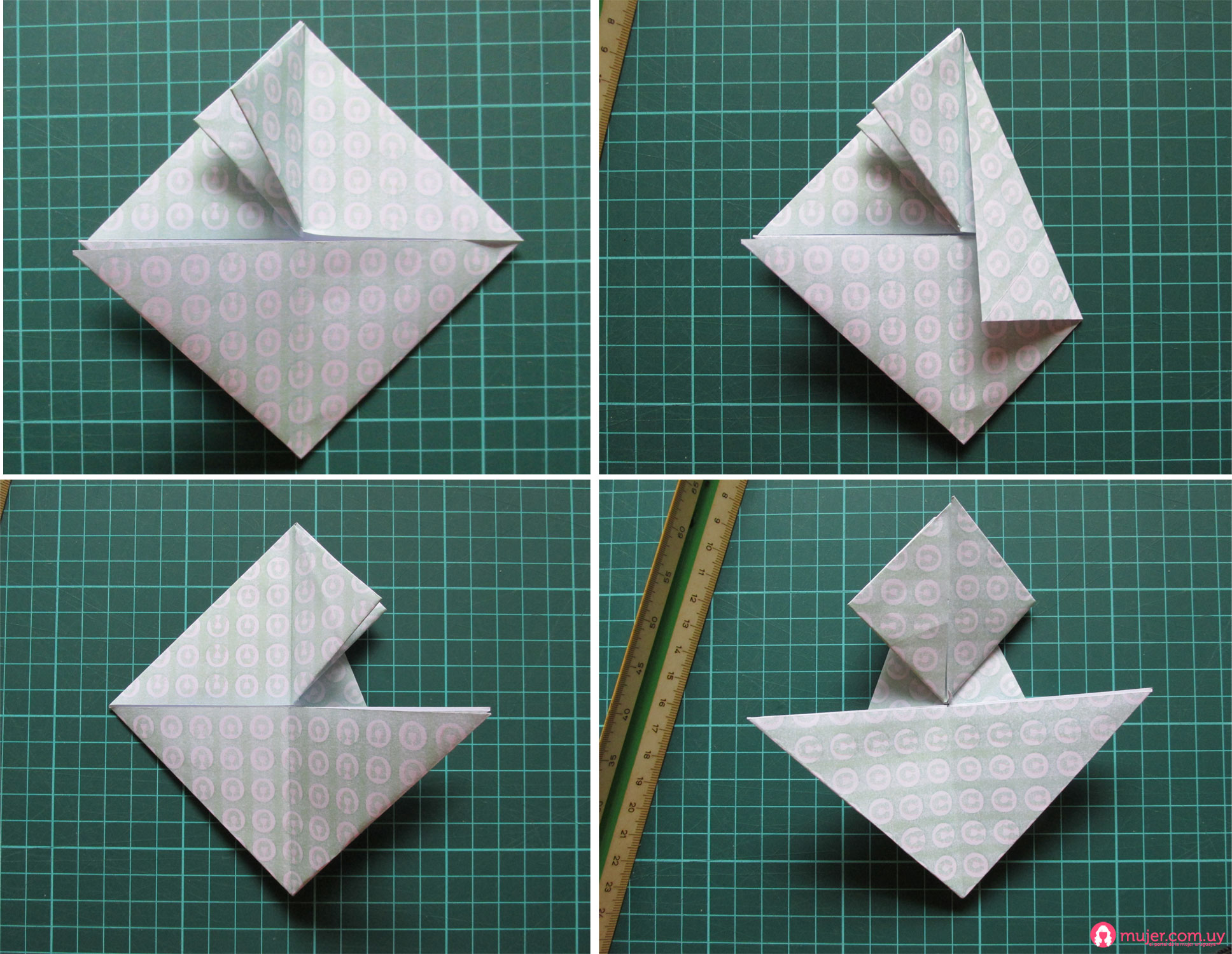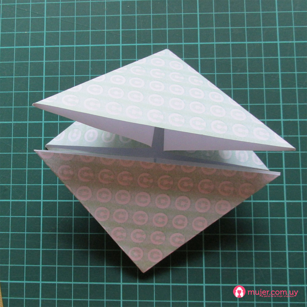 Luego lo doblamos al medio de cada cuadrado, llevando las diagonales hacia adentro, como se ve en la foto.