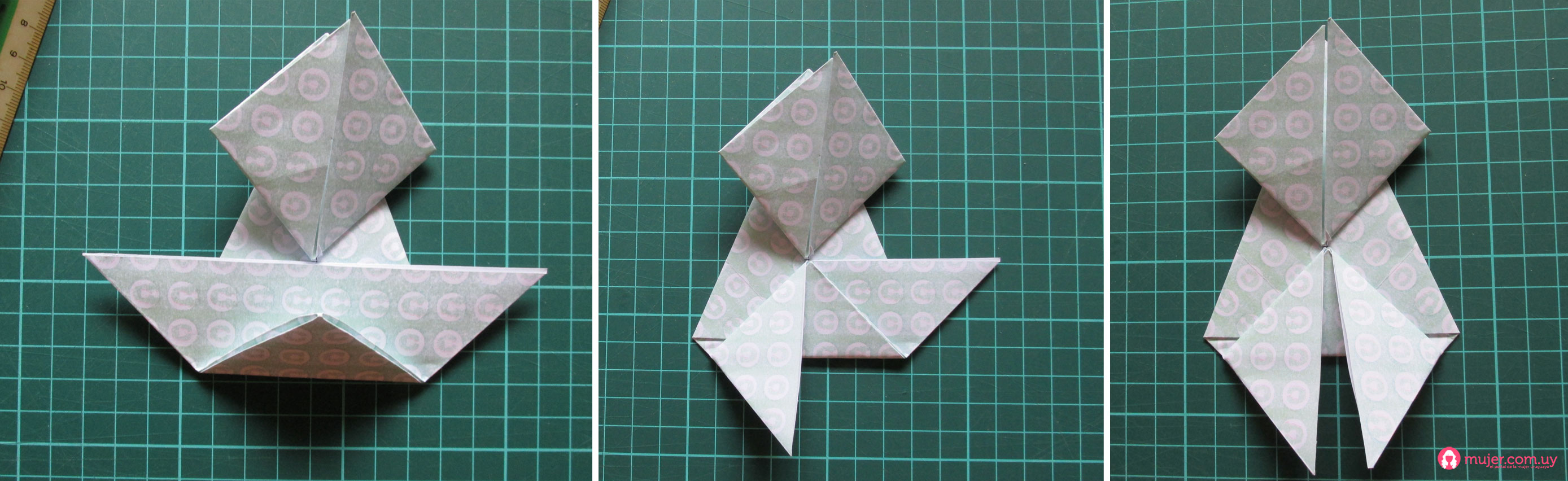 Luego doblamos estos triángulos sobre sí mismos, haciendo triángulos más chicos, como muestra la foto. Y hacemos lo mismo con los triángulos de arriba. Estas serán las patitas del sapo! :)