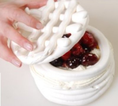 Disponer una base de espiral de merengue en el plato. Con la manga de crema bordear al merengue, luego colocar el aro de merengue sin que se mueva. Rellenar su interior con la crema y los frutos rojos. Tapar con el enrejado de merengue.