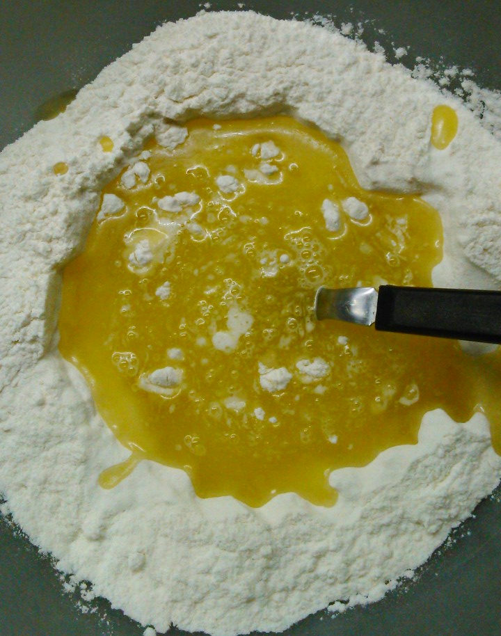 Primero mezclamos los ingredientes secos, y hacemos un hueco en el medio, para poner el agua y el aceite. En este caso utilizamos aceite de oliva, que le da un toque de sabor diferente.