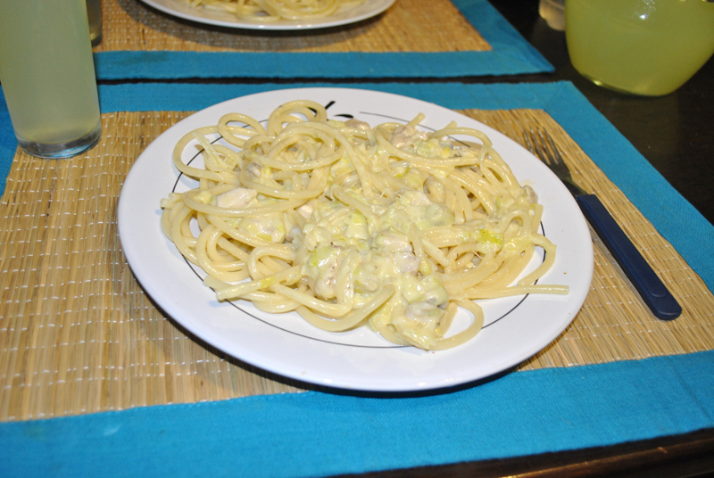 Para prepararlos debemos por un lado hervir los tallarines (o spaghetti), y por otro preparar la salsa para lo cuál picaremos 2 puerros y media cebolla que saltaremos en una sarten (con un poquito de aceite o agua), y luego en el mismo sarten agregaremos 250ml de crema de leche (o crema doble) y cocinaremos hasta que se reduzca…